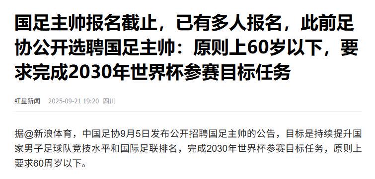 红星新闻2025-09-21 国足主帅报名截止,已有多人报名,此前足协公开选聘国足主帅:原则上60岁以下,要求完成2030年世界杯参赛目标任务