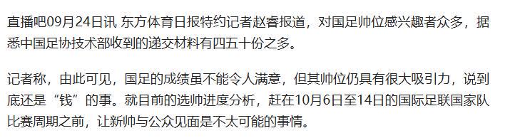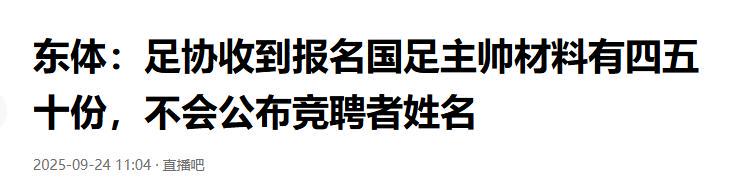2025-09-24 直播吧 东体:足协收到报名国足主帅材料有四五十份,不会公布竟聘者姓名