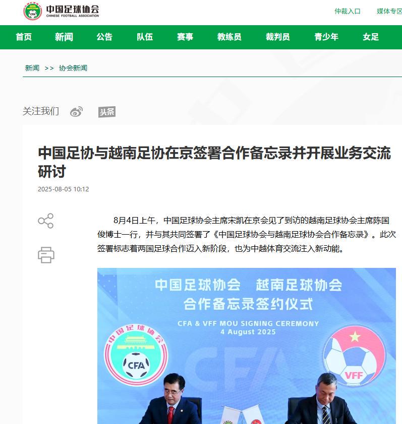信源来源:中国足球协会 2025-08-05 中国足协与越南足协在京签署合作备忘录并开展业务交流研讨