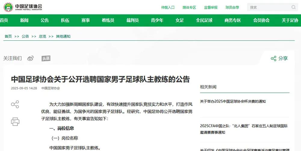首先就是岗位,协会这次招聘的是,我国男子足球队的主教练。