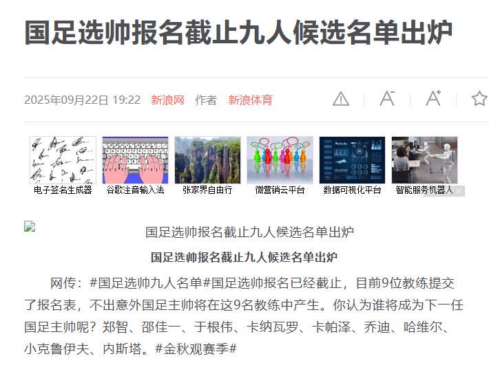 新浪体育2025年09月22日 国足选帅报名截止九人候选名单出炉